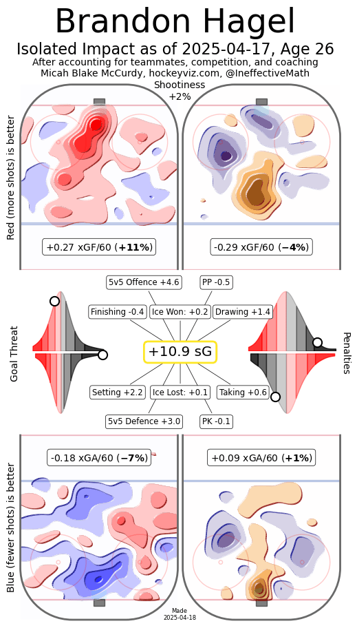 Overall, Hagel accumulated a score of +10.9 sG. A score that shoots him off the chart and is among the best in the league. Hagel’s defensive impact will likely have him draw some votes for the Selke Trophy this year.